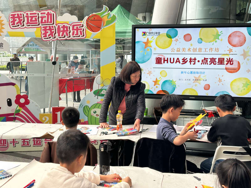此外,“童HUA乡村・点亮星光”艺术共创嘉年华活动的优秀美术作品展和相关主题公益美术创意工作坊同步开展,展出广州市涉农区乡村孩子的100余件优秀平面绘画作品和手工作品,以及城乡孩子共同创作的爱心徽章。