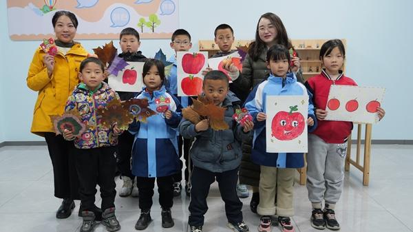 在他们负责的创意社团,孩子们捡来枫叶,涂上缤纷色彩;苹果也被当作“模特”,在画纸上变身“主角”。