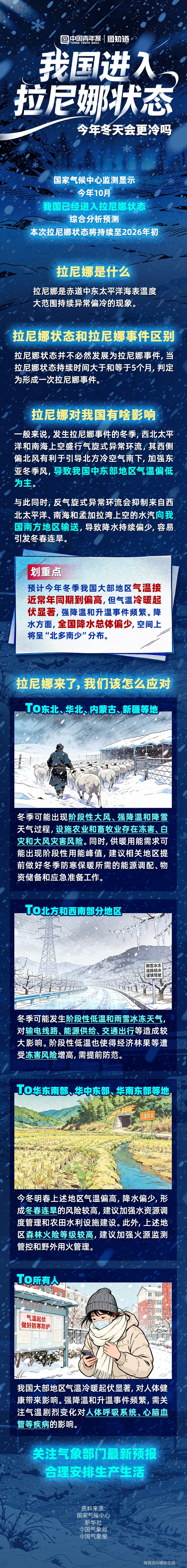 国家气候中心监测显示,今年10月,我国已经进入拉尼娜状态。综合分析预测,本次拉尼娜状态将持续至2026年初。拉尼娜对我国有什么影响?应该如何应对?读图转发提醒身边的人,科学应对,不怕“魔法攻击”。