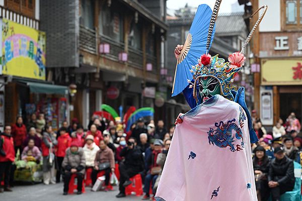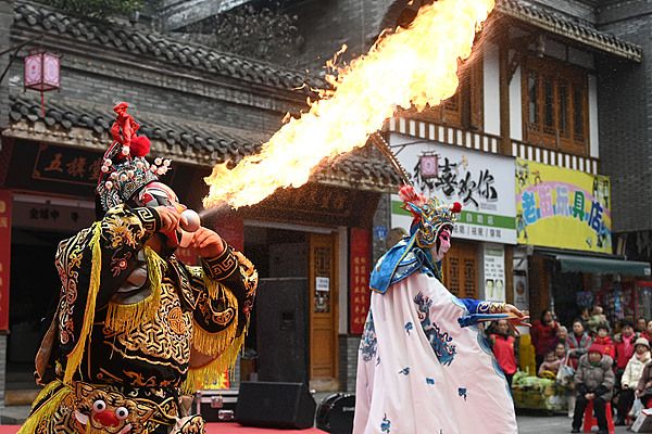 2025年12月16日,四川内江,川剧演员为群众表演川剧绝活“变脸吐火”。