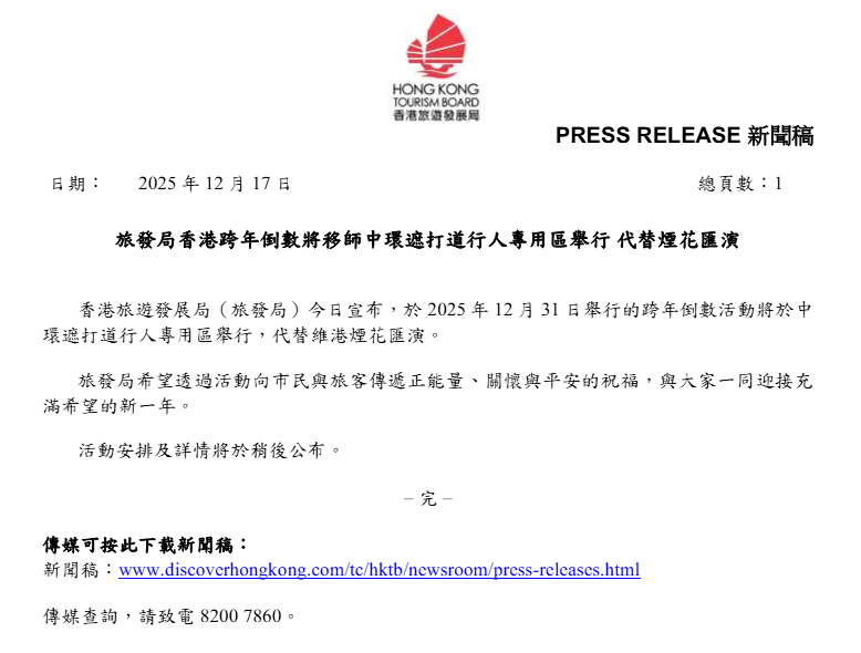 据广州日报消息,12月17日,香港旅游发展局(旅发局)宣布,于2025年12月31日举行跨年倒数活动,代替维港烟花汇演。旅发局表示,希望透过活动向市民与旅客传递正能量、关怀与平安的祝福,与大家一同迎接充满希望的新一年。