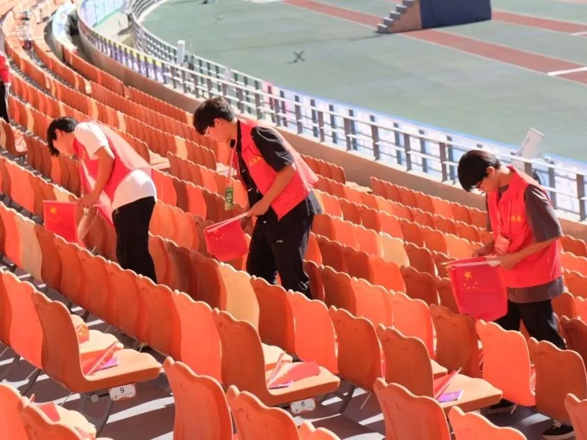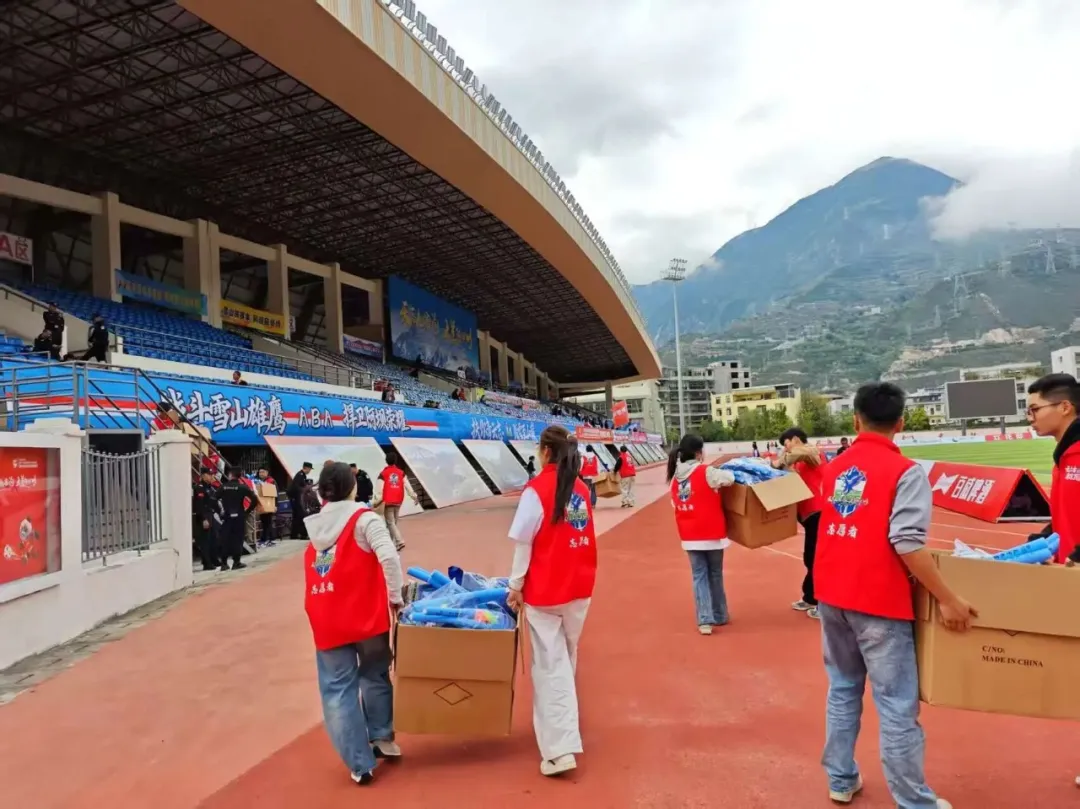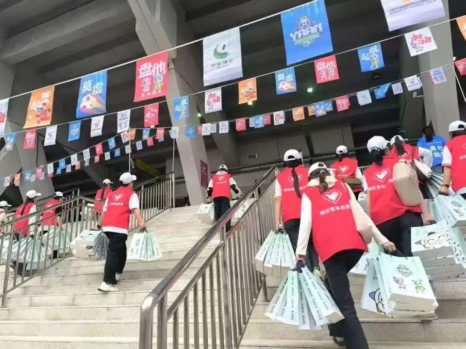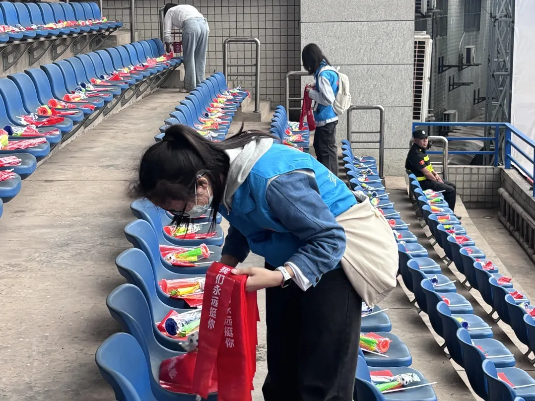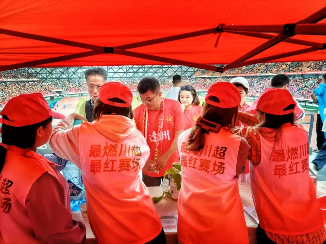 团攀枝花市委联合市融媒体中心组织114名青年志愿者助力川超。场外,检票口的志愿者引导观众有序入场;场内,志愿者们整齐摆放物资、为观众指引座位,在看台挥舞旗帜带动现场氛围。