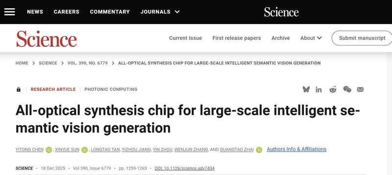 中国青年报客户端上海12月19日电(中青报·中青网记者 王烨捷)今天,上海交通大学集成电路学院陈一彤课题组的研究以《大规模智能语义视觉生成全光芯片》(All-optical synthesis chip for large-scale intelligent semantic vision generation)发表于国际顶级学术期刊《科学》(Science)上。这项研究在新一代算力光芯片方向取得重大突破,首次实现了支持大规模语义视觉生成模型的全光计算芯片LightGen。