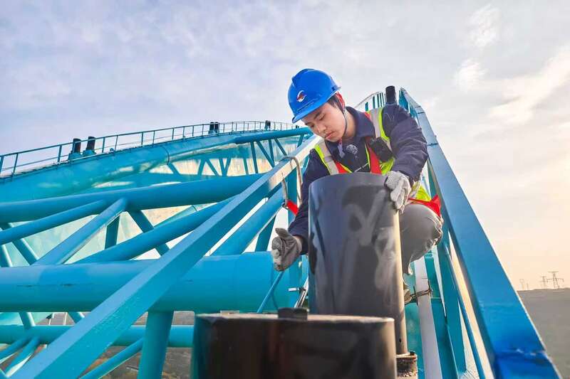 “夜间检查其实精神更为集中,也更加专注,我们头灯的光柱,就是这150米高空的唯一光源,光线只能聚焦在眼前的那一点,这样反而能发现白天容易被忽略的细节。”副工长姚致远说。