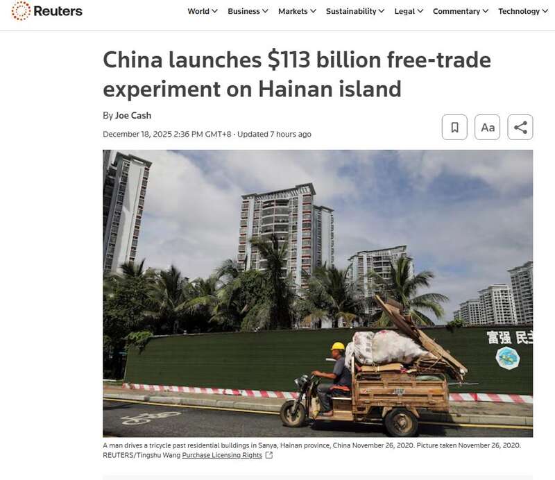 “值得注意的是,封关日期12月18日恰逢1978年中国开启改革开放路线的纪念日。”“德国之声”分析称,海南是中国最早的特区之一,如今在医疗、教育等服务领域进一步放宽了外资准入。在地区局势升温的背景下,海南的战略地位愈发凸显。