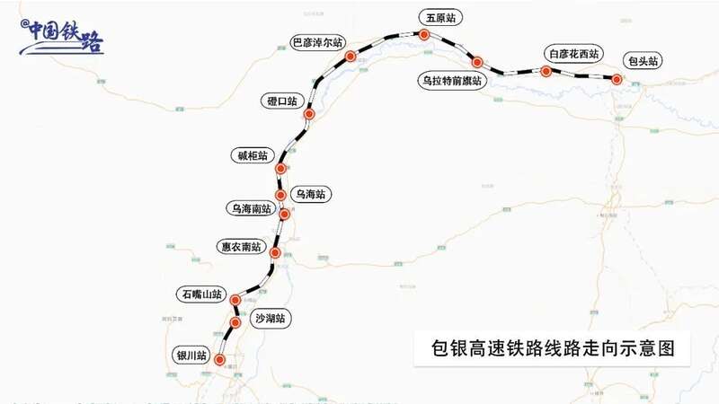 包银高铁起自包头站,经内蒙古自治区包头市、巴彦淖尔市、鄂尔多斯市、乌海市,宁夏回族自治区石嘴山市、银川市,接入银川站,正线全长519公里,设计时速250公里,实行分段建设。其中,惠农至银川段全长97公里,已于2024年10月开通运营,此次开通的包头至惠农段全长422公里,共设包头、白彦花西、乌拉特前旗、五原、巴彦淖尔、磴口、碱柜、乌海、乌海南、惠农南10座车站,其中包头、巴彦淖尔、乌海、惠农南站为既有车站,其余车站为新建车站。