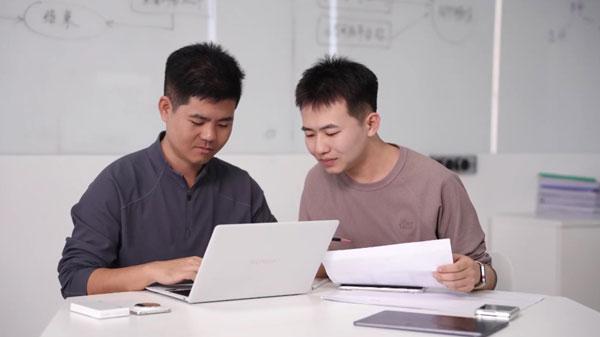 肖宇飞(右)与伙伴探讨应用功能设计。受访者供图