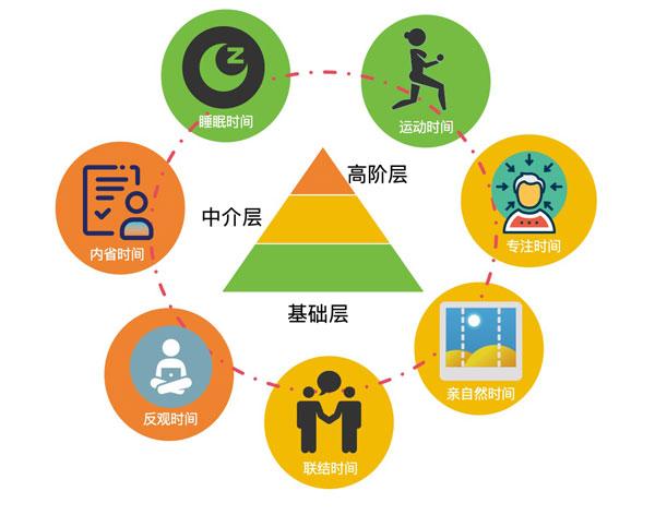 “七时间模型”的三层金字塔-循环心理生态图(睡眠时间、运动时间属于基础层,专注时间、亲自然时间、联结时间属于中介层,反观时间、内省时间属于高阶层)。受访者供图