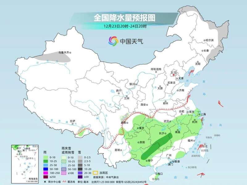 24日,北方的雨雪将会收尾,长江沿江及其以南地区仍有大范围降雨,以小到中雨为主。