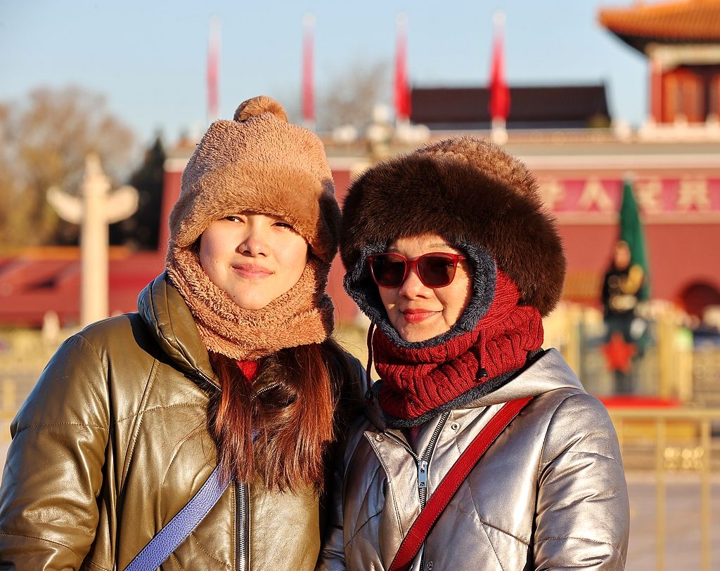 北京气温骤降迎冬至 游客“全副武装”游览天安门广场