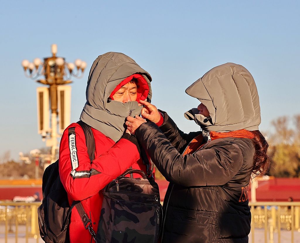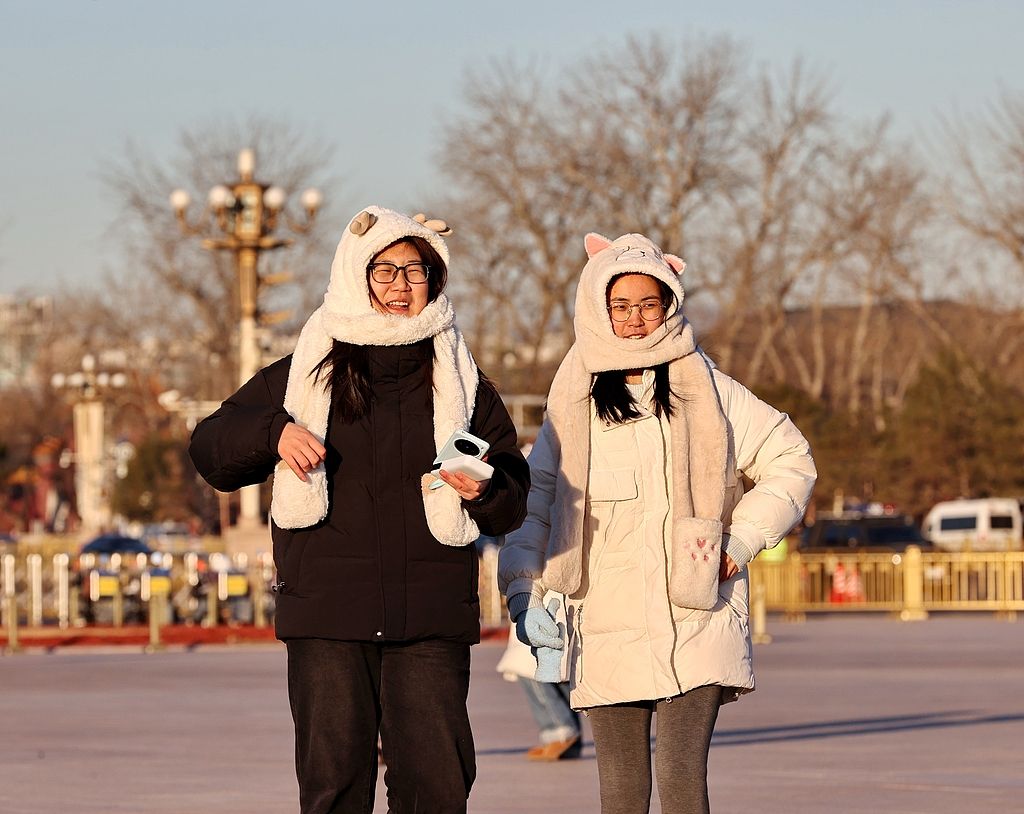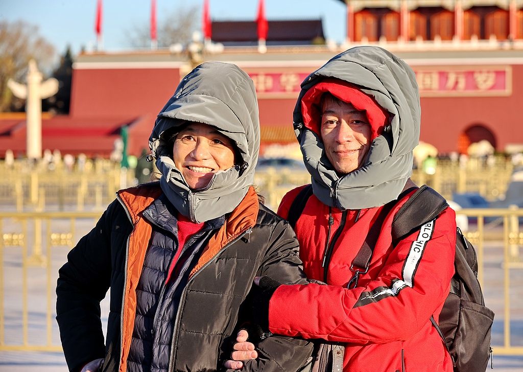 2025年12月21日,北京,游客“全副武装”游览天安门广场。当日是冬至节气,在冷空气影响下,最高气温骤降至3摄氏度,体感干冷。在天安门广场游客纷纷穿上厚冬装、包裹严实御寒。