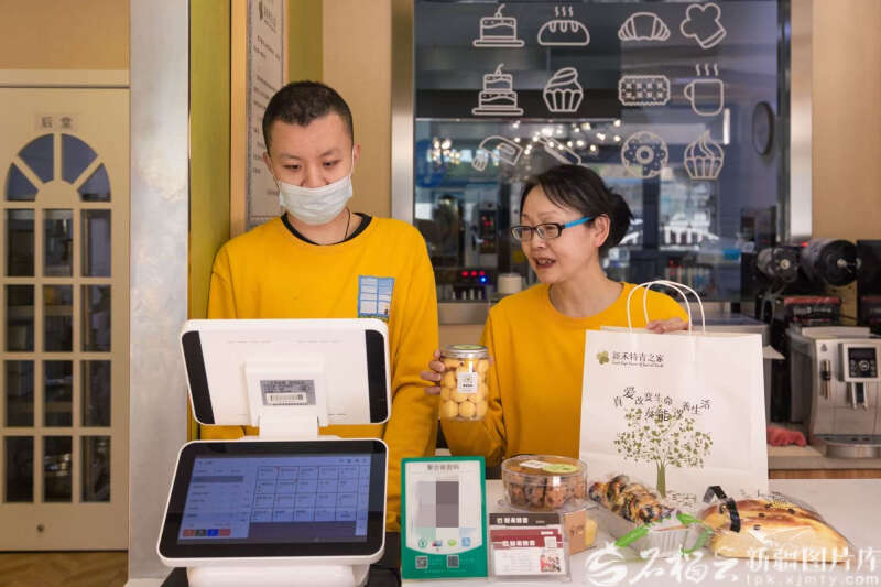 12月17日,乌鲁木齐新禾特青烘焙坊的烘焙间,水声沥沥。24岁的小赵正熟练地将使用过的工具一一清洗、归位。“清洁、备料,我都能干。”介绍起自己的工作,他脸上洋溢着骄傲,“我用自己挣的工资给家人买了我们自己烘焙坊的糕点。”