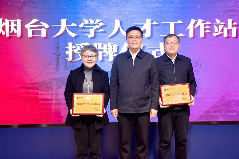 卢国强为北京大学学生就业指导服务中心、清华大学学生职业发展指导中心授牌成立“烟台大学人才工作站”。(烟台大学供图)