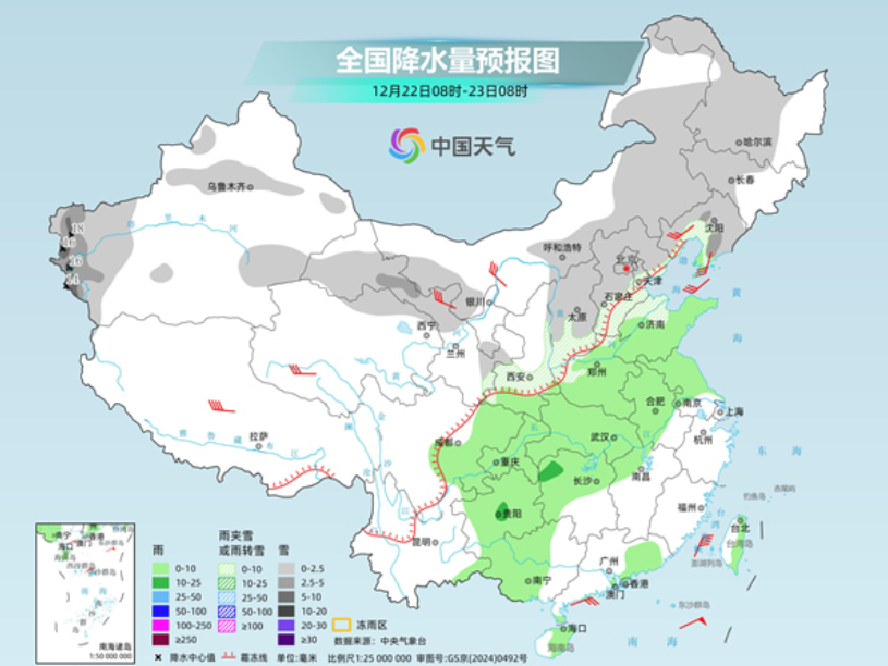 今天(12月22日)起,我国中东部雨雪增多,未来三天北方大部将迎降雪,南方大部以阴雨天气为主。此外,本周我国大部气温波动频繁,其中东北地区气温起伏较大,需注意适时调整衣物。