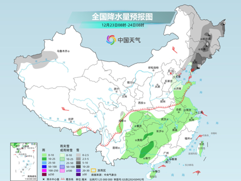 明天,东北地区、新疆南疆西部山区、华北东部、山东北部等地部分地区有小到中雪或雨夹雪,其中,黑龙江中东部、吉林中部、辽宁东部局地大到暴雪。黄淮东部、江淮、江汉大部、江南北部和西部、西南地区东部、广西、广东东南部沿海、海南岛东部、台湾岛东部等地部分地区有小雨,其中,湖南西部、贵州东北部、广西中部等地部分地区有中雨。