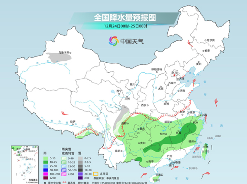 后天,新疆沿天山地区、西藏东南部、川西高原等地部分地区有小雪或雨夹雪。江汉南部、江南、西南地区东部、华南北部和西部、海南岛东部、台湾岛等地部分地区有小雨,其中,湖南中南部、江西中部和东北部、浙江西南部、广西西南部和北部等地部分地区有中雨。