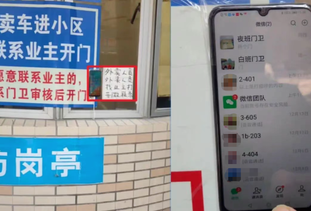 视频显示,一部手机被用胶带固定在小区大门口,外访亲友或外卖小哥想进小区,可以直接用这部手机上的微信与门卫或对应业主联系,可语音,也可视频通话。