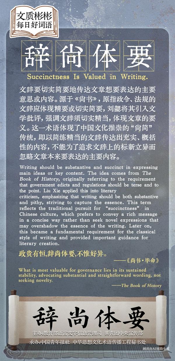 Writing should be substantive and succinct in expressing main ideas or key content. The idea comes from The Book of History, originally referring to the requirement that government edicts and regulations should be terse and to the point. Liu Xie applied this into literary criticism, emphasizing that writing should be both substantive and pithy, striving to capture the essence. This term reflects the traditional pursuit for "succinctness" in Chinese culture, which prefers to convey a rich message in a concise way rather than seek novel expressions that may overshadow the essence of the writing. Later on, this became a fundamental requirement for the classical style of writing and provided important guidance for literary creation.
