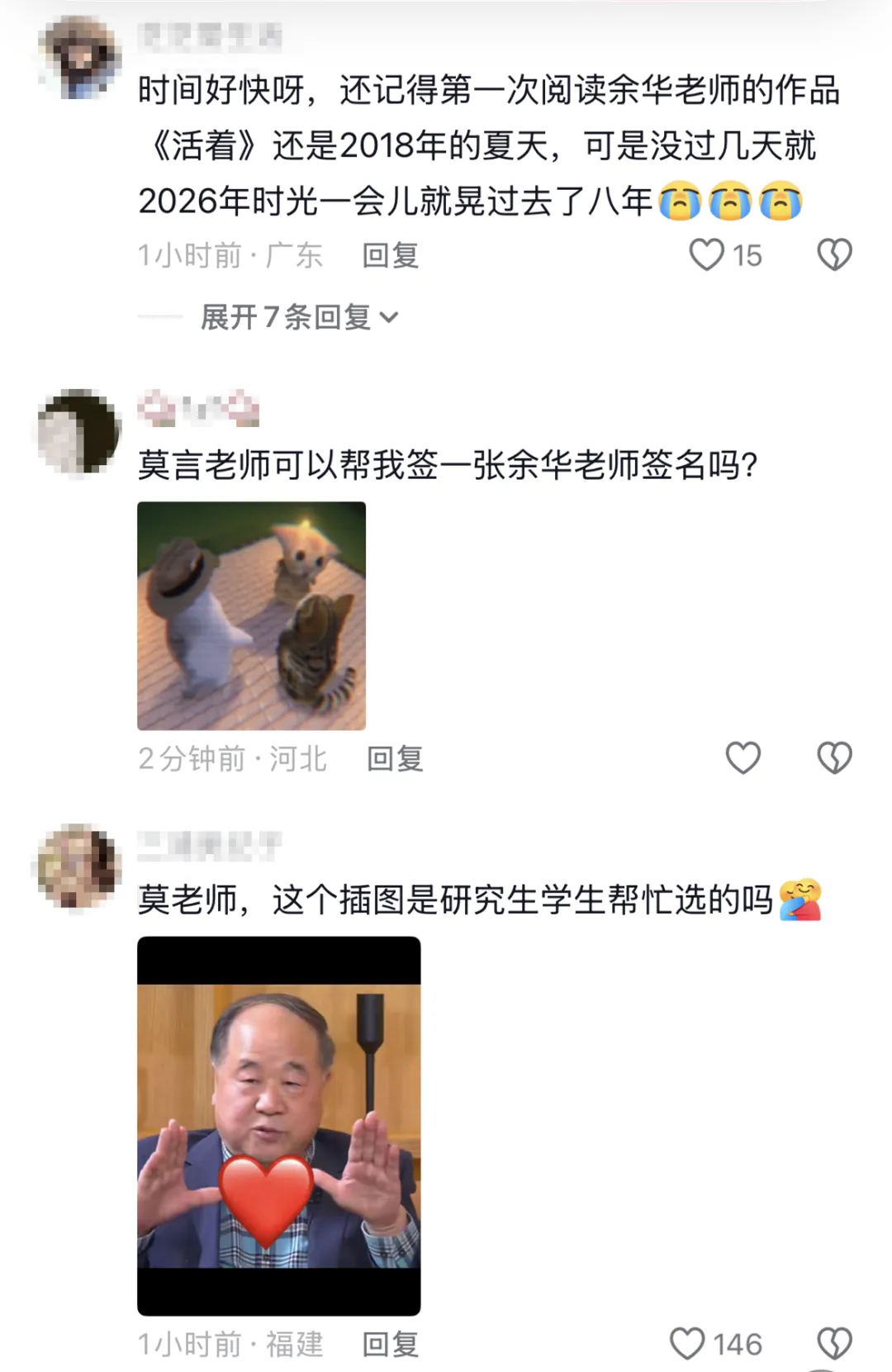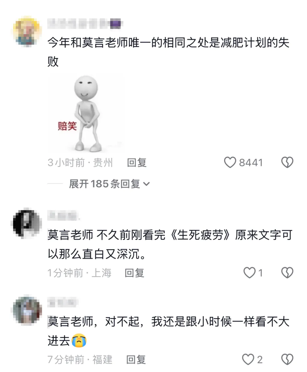 中国青年报(ID:zqbcyol 整理:张小松)来源:抖音@莫言、@红星新闻、梨视频、网友评论。