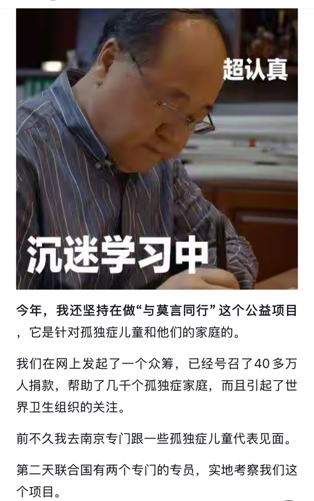 莫言还分享了今年去过的地方、看过的书以及坚持在做“与莫言同行”这个公益项目,已经号召了40多万人捐款,帮助了几千个孤独症家庭,而且引起了世界卫生组织的关注。