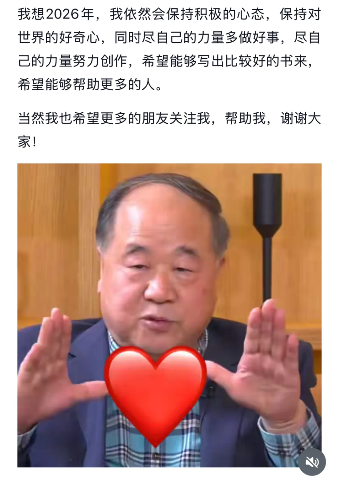 12月23日,知名作家莫言在社交账号上发布了2025年终总结。