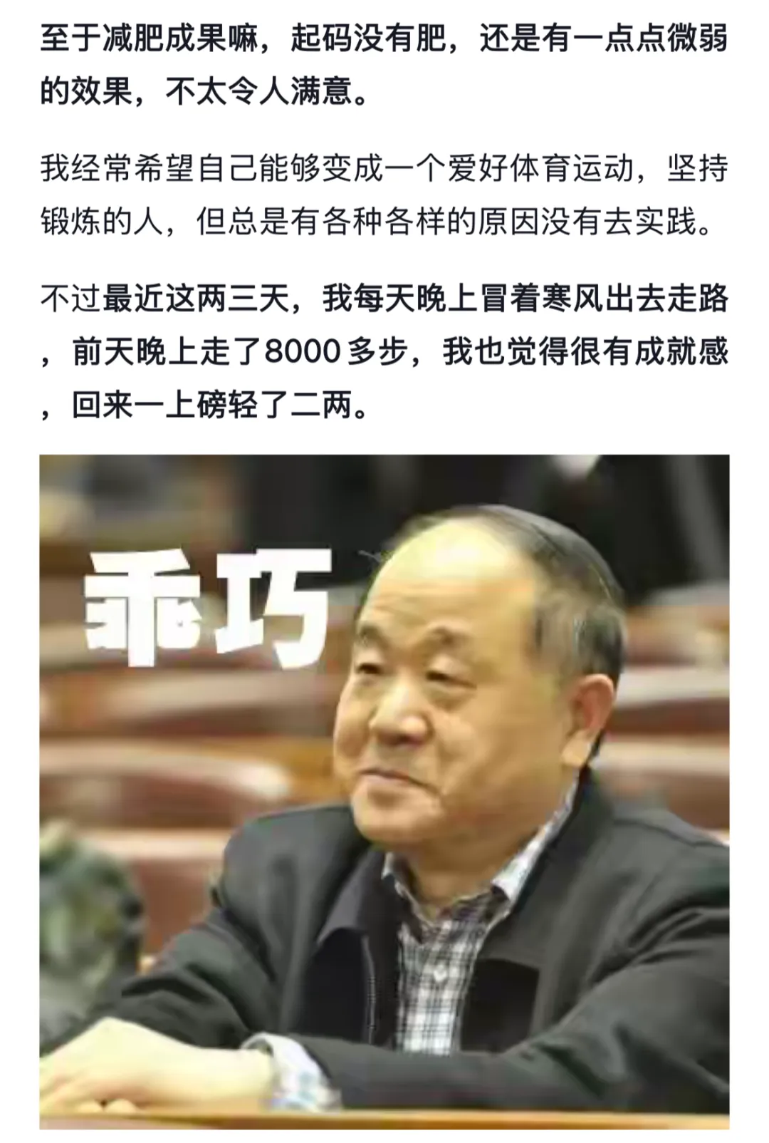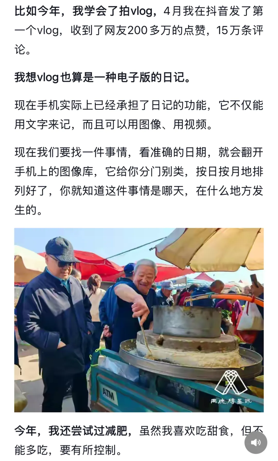 今年70岁的莫言学会了拍vlog,用电子版的日记记录生活。莫言称今年尝试过减肥,“至于减肥成果嘛,起码没有肥,还是有一点点微弱的效果,不太令人满意。”