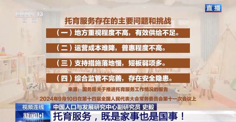 中国人口与发展研究中心副研究员 史毅:保障安全是托育服务发展的一个根本底线要求,在此次立法的草案里面,我们可以明确看到本次的草案不仅从机构的安全,从人员的安全,从设施的安全,设备的安全,包括我们服务的安全,流程的安全,卫生的安全,膳食的安全,以及整个管理过程的安全,从多个角度都提出了相应的表述和条款。
