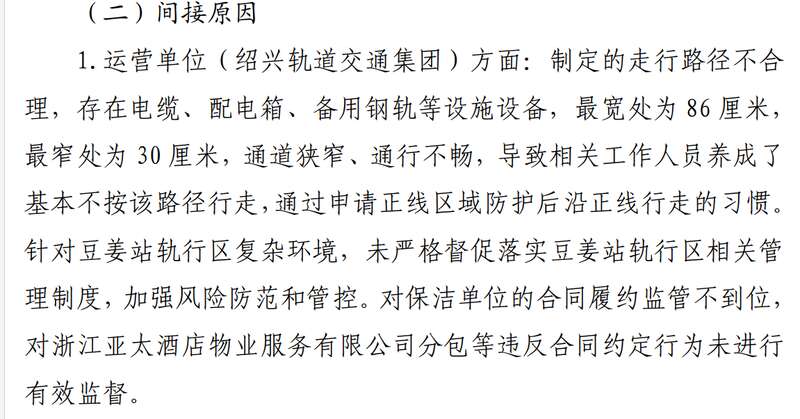 该报告认为,绍兴轨道交通集团对保洁公司的合同履约监管不到位,对浙江省亚太酒店物业服务有限公司分包等违反合同约定的行为没有有效监督;浙江亚太酒店物业服务有限公司未对豆姜站的特殊情况对保洁人员开展针对性培训,保洁人员未按规定穿戴反光背心等安全防护用品。