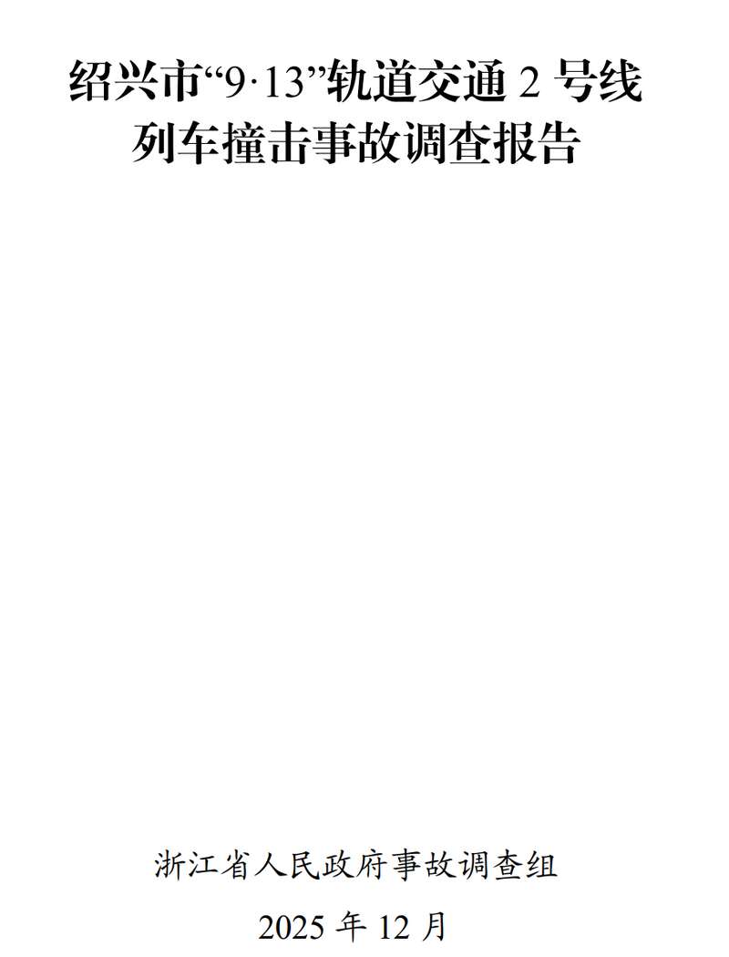 中国青年报客户端12月25日电(中青报·中青网记者 魏晞)今日,浙江省发布《绍兴市“913”轨道交通2号线列车撞击事故调查报告》。9月13日23时25分许,绍兴市轨道交通 2 号线一返场维修的空载列车,在檀渎站开往豆姜站下行区间与 4 名保洁人员 发生碰撞,造成3人死亡、1人重伤。