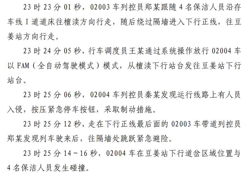 该报告称,当天23时23分01秒,4名保洁人员在02003车列控员郑某的带领下从豆姜站存车线I道步行至存车线II道,继续执行02005车保洁作业;4名保洁员下车后,未按规定路径行走,违规进入下行正线轨行区,02003车列控员郑某见状,无有效劝阻行为,并跟随保洁员行走。