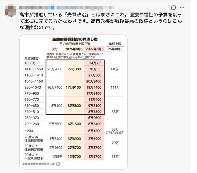 日本网友在社交媒体平台X上发帖称,“高市所推行的‘先军政治’,指的正是这种行径。其核心方针就是削减医疗与福利预算,将资金挪用于军备扩张。高市政权会被称为战后最糟糕的政权,原因也正在于此。”