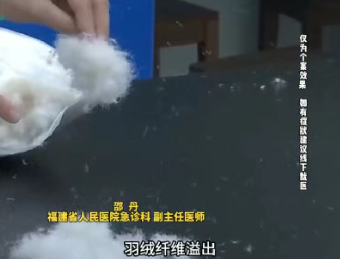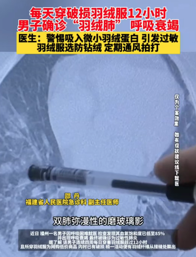 福建省人民医院专家接受采访时指出,羽绒中微小的蛋白颗粒被持续吸入肺泡后,即便对非过敏体质者,也可能引发免疫反应并攻击肺组织,因此这类问题也被称为“羽绒肺”。