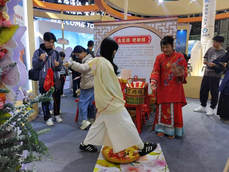 汕头招聘区,一位求职大学生体验汕头的传统成人礼“出花园”。本次招聘会突出城市推介,让求职者沉浸式感受广东文化魅力。中青报•中青网记者武欣中/摄