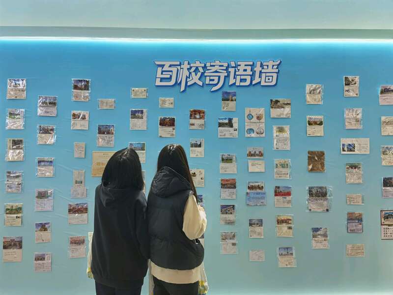 招聘会现场“百校寄语墙”上,高校校领导的亲笔祝福明信片传递着对学子赴粤发展的殷切期望,吸引众多求职者驻足寻找母校卡片、拍照留念。中青报•中青网记者武欣中/摄