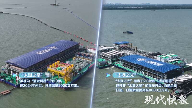 早于“太湖之光”打造的“太湖之星”,被视为“清淤利器”的1.0版,在2024年问世,日清淤量5000立方米。如今,“太湖之星”和“太湖之光”分别在太湖的无锡市区段、宜兴段水域作业,被称为太湖清淤“星光”CP。这些年,王冰一路见证国产清淤装备从跟跑者成为领跑者。王冰介绍,传统的清淤船在挖出淤泥后,要运到岸边露天堆放,自然脱水风干。但这样占地多、周期长、运输难、花费也比较高,还容易影响周边的生态环境。