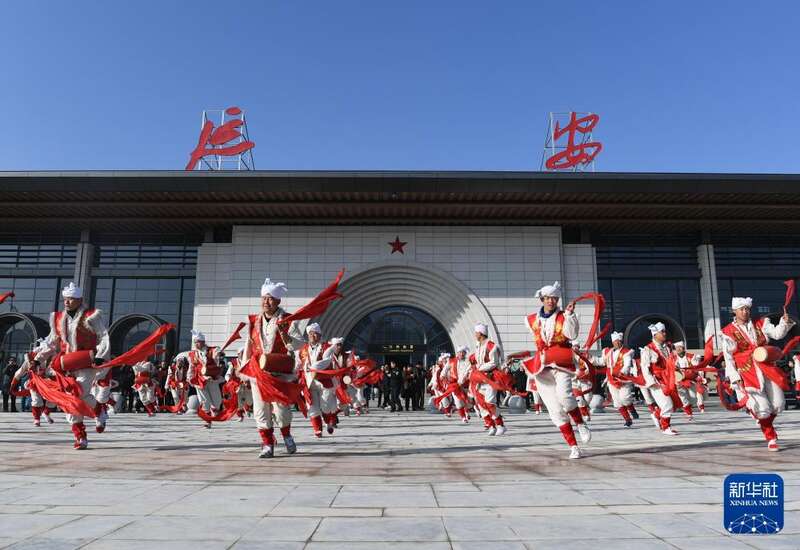 2025年12月26日,西延高铁首发列车从延安站驶出。新华社发(刘一江 摄)