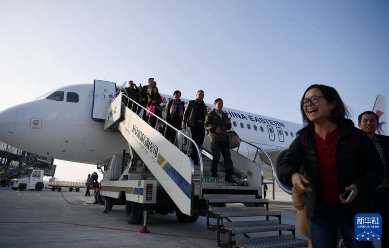 2018年11月8日,首班抵达南泥湾机场的乘客走下飞机。新华社记者 张博文 摄