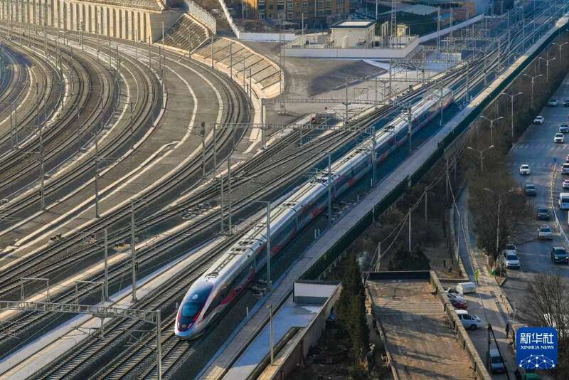 2025年12月26日,西延高铁首发列车从延安站驶出。新华社记者 张博文 摄