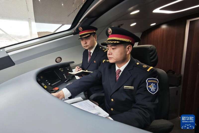 2025年12月26日,西延高铁首发列车司机在进行开车前的准备工作。新华社发(曹欣 摄)