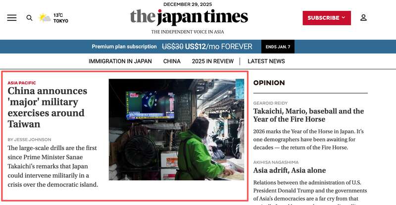 日本历史最悠久的英文日报《日本时报》在网站头条位置刊发题为《中国宣布在台湾周边举行“大规模”军事演习》。报道称,12月29日,中国(大陆)在台湾周边组织陆军、海军、空军和导弹部队举行“大规模”军事演习。这是自高市早苗首相11月初宣称“日本可能对台湾进行军事干预”以来,中方首次举行此类演习。