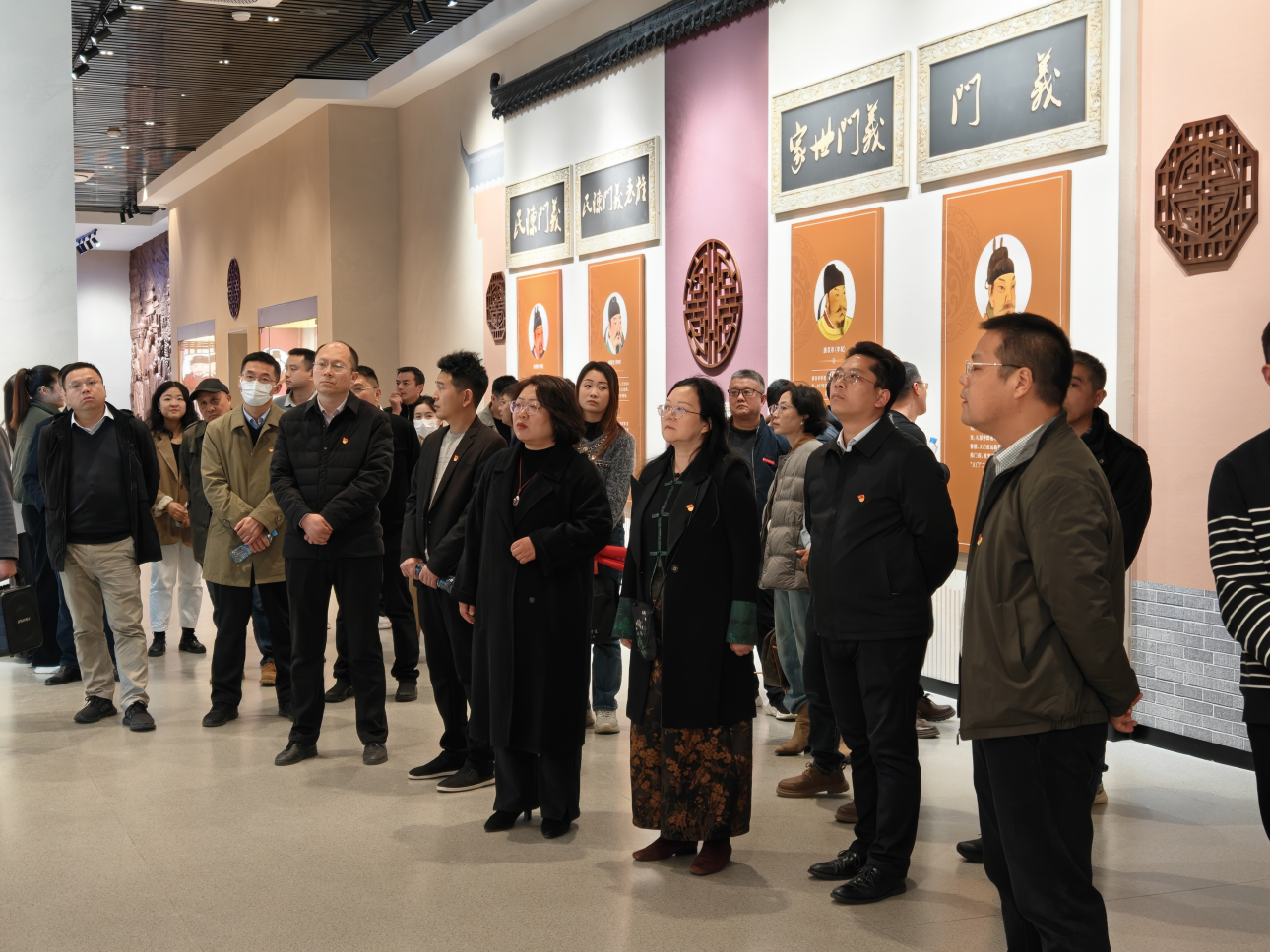 义门陈非遗展览馆内,在讲解员的带领下,大家依次参观了义门陈家族变迁、家法家训和教育体系等多个展厅,通过实物、图文与多媒体,深入了解义门陈的历史变迁与文化传承。展厅内的《家法三十三条》《家训十六条》《家范十二则》等家规家训,其为人、为官、为事的行为准则,忠于国家、孝敬父母、亲和兄弟、敦睦邻里的家规,以及孝悌为先,遵纪守法,明德修身的家训,更是吸引大家驻足细品。全体党员干部还实地参观了旌表台广场、鼓楼等历史标志性建筑。