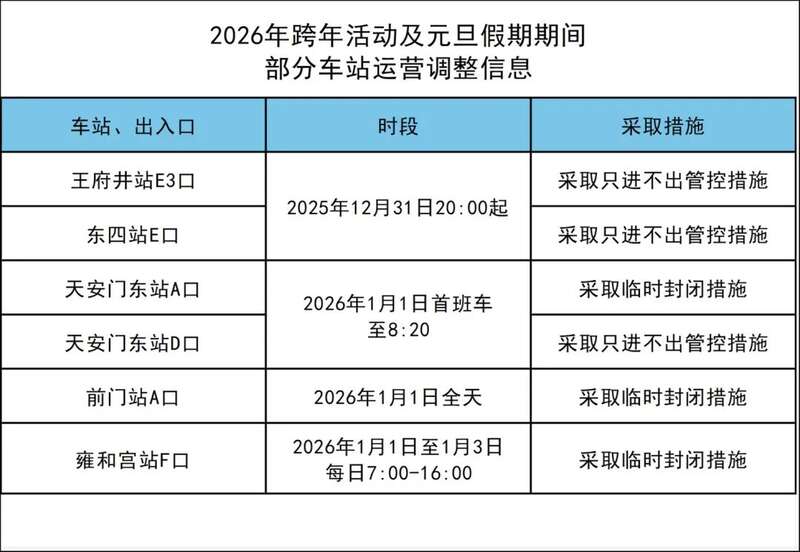 为满足2026年跨年活动及元旦假期期间乘客出行需求,确保乘客平安、顺畅出行,地铁公司密切关注旅游景点、商圈等周边车站客流情况,对部分线路车站采取“分时段”运营调整措施。