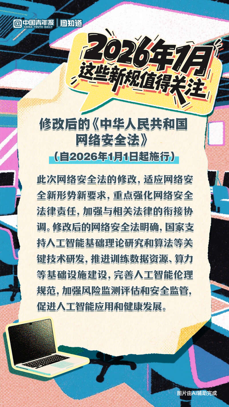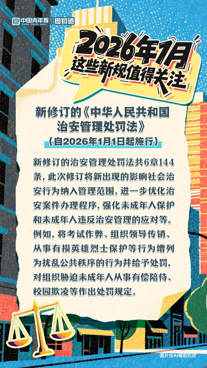 新修订的治安管理处罚法将施行,修改后的网络安全法回应人工智能发展,幼儿园收费政策将完善……2026年1月,这些新规值得关注,多图速览。