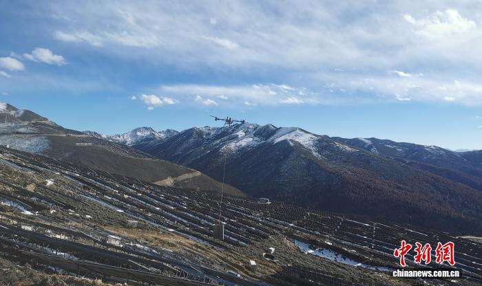 图为2025年12月,雅砻江茶布朗光伏电站建设中,使用无人机运输光伏组件。 (雅砻江流域水电开发有限公司供图)