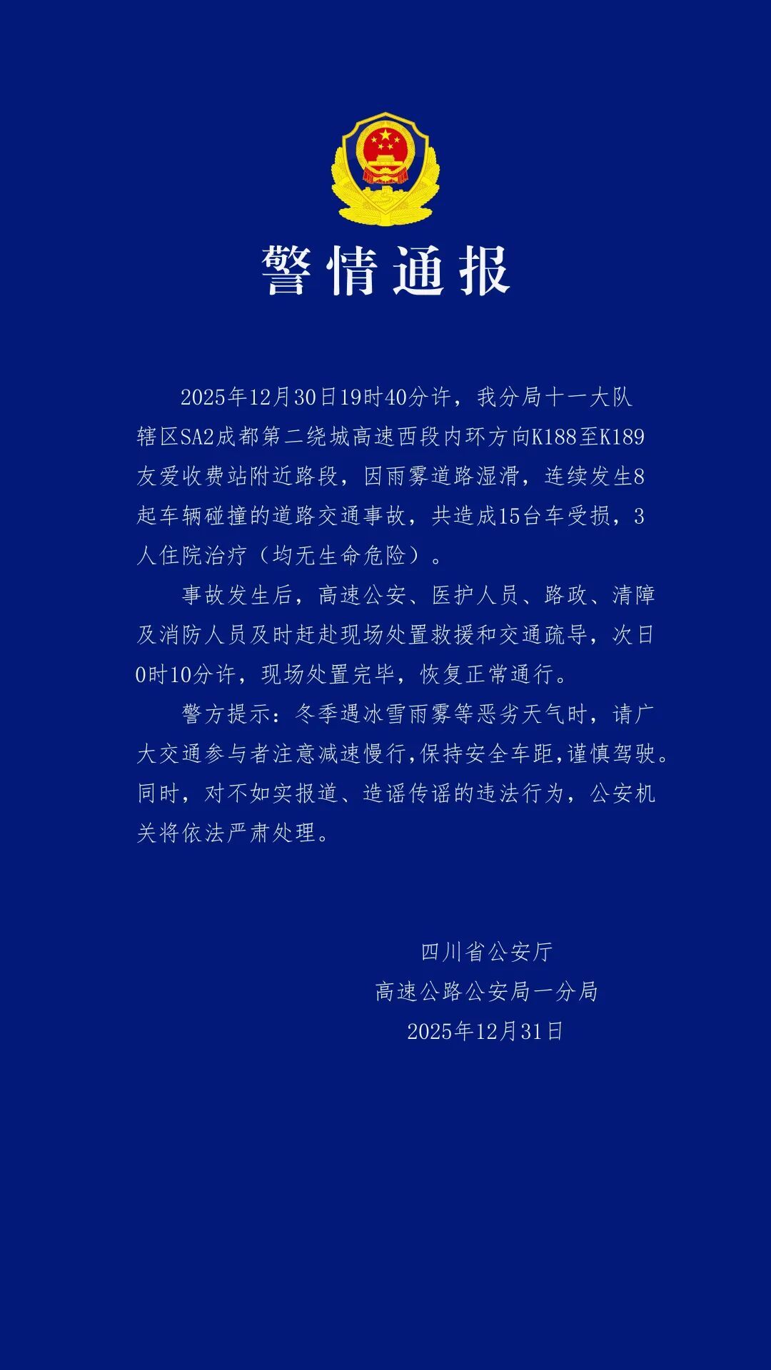 12月30日19时40分许,该分局十一大队辖区SA2成都第二绕城高速西段内环方向K188至K189友爱收费站附近路段,因雨雾道路湿滑,连续发生8起车辆碰撞的道路交通事故,共造成15台车受损,3人住院治疗(均无生命危险)。次日0时10分许,现场处置完毕。