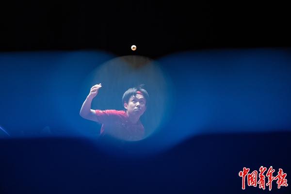 2025年11月15日,澳门,十五运会乒乓球男子团体赛,北京队选手王楚钦在比赛中。11月9日至21日,第十五届全国运动会在广东、香港、澳门举行,这是全运会首次跨境举办。赛场星光熠熠,00后刮起青春风暴,成为夺金主力。场上的激情拼搏,更掀起了全民运动热潮,公园、广场、地铁站,处处可见运动的身影。中青报·中青网记者 李隽辉/摄