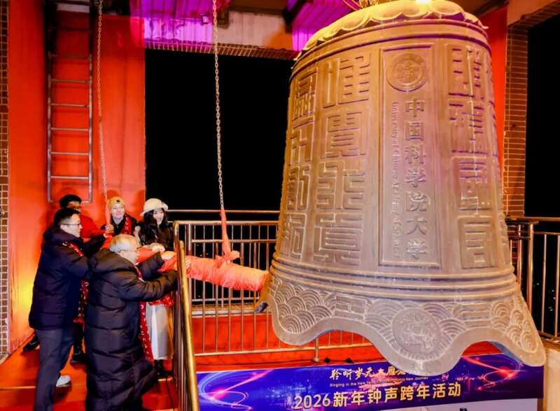 “五、四、三、二、一……”随着跨年倒计时响起,该校密码学院长聘教授、博士生导师孙思维,前沿交叉科学学院院长、教授郭田德,国家奖学金获得者、2023级网络空间安全专业本科生姜俊彦,2025级星际航行学院计算机技术专业研究生任佳绩,来自丹麦的2025级中丹学院创新管理专业硕士研究生JAMIE ANN SECKINGER等五位“时间使者”共同在雁栖湖校区标志性建筑的钟楼顶部敲响新年钟声。与此同时,电子烟花瞬间绽放。
