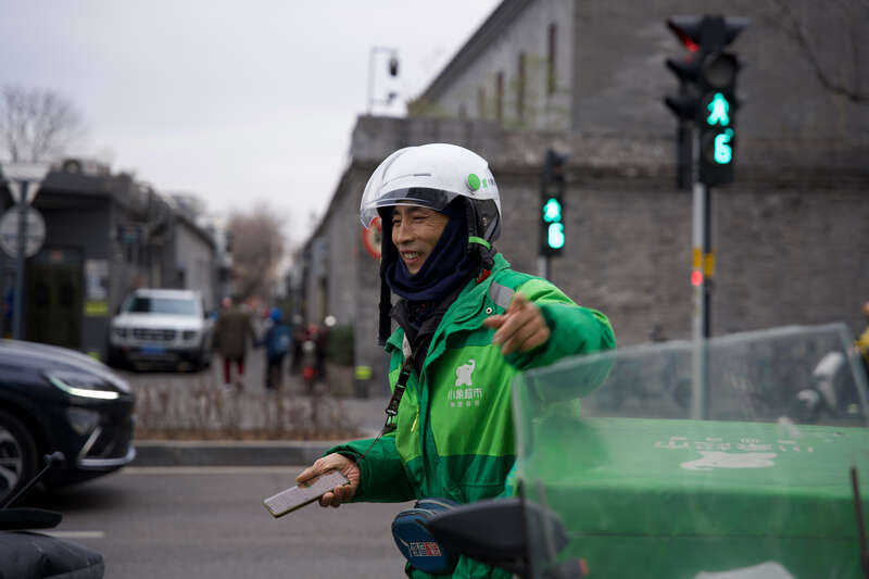 超市配送员在路口等待接货。