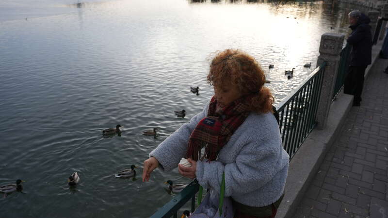 北海公园里,游人正在喂秋沙鸭。