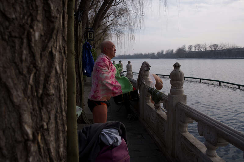 在什刹海冬泳的市民。